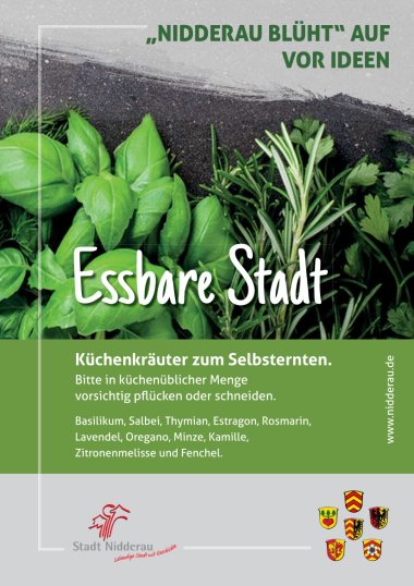 "Nidderau blüht" auf vor Ideen - Essbare Stadt: Küchenkräuter zum Selbsternten.Tipp für alle Nidderauerinnen und Nidderauer: Wenn Sie einen Kübel vor Ihrem Haus betreuen möchten oder eine öffentliche Grünanlage in Ihrer Straße umgestalten möchten, passend zu der Idee „Essbare Stadt“, melden Sie sich im Umweltamt. Wir freuen uns über jede/n Bürgerin/Bürger, die oder der unsere Ideen teilt und über jede „helfende“ Hand