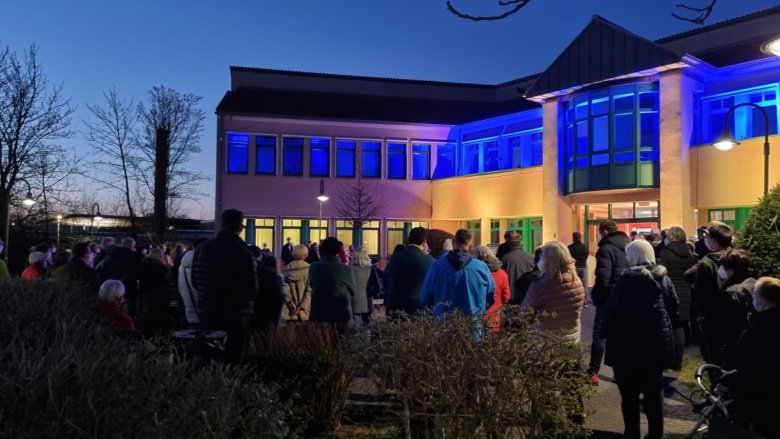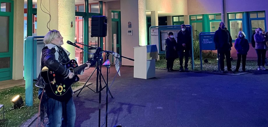 Ihrem Wunsch nach Frieden, Solidarität und Mitmenschlichkeit verliehen über 100 Nidderauerinnen und Nidderauer am Dienstag erneut vor dem blau-gelb beleuchteten Nidderauer Rathaus gemeinsam Ausdruck. Am 27. Kriegstag in der Ukraine kamen sie auf Initiative von Bürgermeister Andreas Bär und Stadtverordnetenvorsteher Jan Jakobi zu einem bewegenden Friedenskonzert mit der Songwriterin und Friedensbotschafterin Dannyjune Smith zusammen.