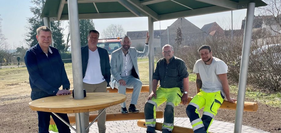 Der Rathauschef dankte Achim Behn für die Unterstützung durch die Deutsche Reihenhaus AG, die einen attraktiven Treffpunkt für die jungen Menschen in Eichen ermöglichte. Modern gestaltet, mit Sitzgelegenheiten und in das Umfeld bestens integriert präsentiert sich der Jugend-Pavillon nun pünktlich zu Beginn des Frühlings. Der Standort wurde gemeinsam mit dem Eicher Ortsbeirat gefunden und ergänzt die neue Begegnungsachse an der Höchster Straße. „Die ersten Rückmeldungen zum neuen Pavillon sind sehr positiv.“, berichtete Andreas Bär und dankte dem Team des Bauhofs, das den Pavillon aufbaute. Zur weiteren Aufwertung wurde rund um den Pavillon eine Fläche gepflastert.