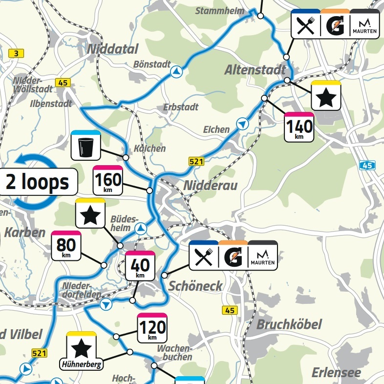 Vom Kilianstädter Berg auf der L3009 kommend führt die Strecke bei der Auffahrt am Windecker Ortseingang auf die B45 und von dort auf die B521 in Richtung Altenstadt. Die Radstrecke verläuft auf dem Rückweg von Kaichen kommend auf der Umgehungsstraße und dann direkt auf die B 521 in Richtung Büdesheim.