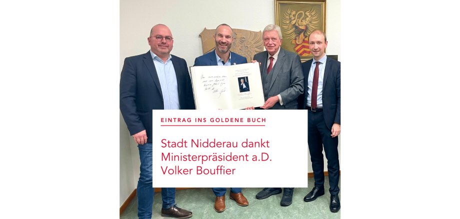 Er war Brückenbauer, jovialer Landesvater, „ewiger Ministerpräsident“: Volker Bouffier hat sich am Montag in das Goldene Buch der Stadt Nidderau eingetragen. Als Präsent überreichten Bürgermeister Andreas Bär und Erster Stadtrat Rainer Vogel in Anwesenheit des Landtagsabgeordneten Max Schad und weiteren Magistratsmitgliedern an den 71-Jährigen die von einer einheimischen Konditorei produzierten Nidderauer Pralinen. „Die Stadt Nidderau dankt Volker Bouffier für seine Verdienste zum Wohle des Landes Hessen und zollt Anerkennung für eine große politische Karriere, die weit über die Landesgrenzen hinaus Spuren hinterlassen hat“, würdigte Bär den gebürtigen Gießener. 50 Jahre lang war Bouffier politisch aktiv, davon zwölf Jahre als Hessischer Ministerpräsident und zuvor fast ebenso lange als Innenminister, bevor er aus freien Stücken seine politische Karriere beendete.