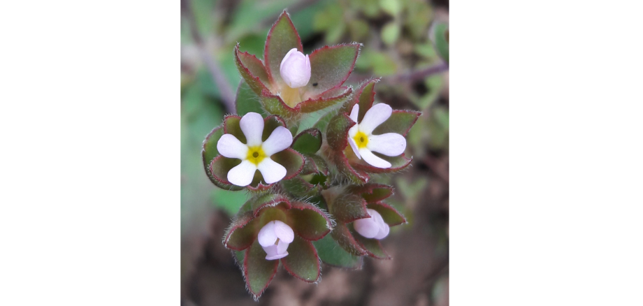 Früher als sonst, nämlich schon seit Ende März, blüht der Großkelchige Mannsschild (Androsace maxima) im Feldflora-Reservat der Stadt Nidderau. Er wird nur drei bis 15 Zentimeter hoch und man kann ihn leicht übersehen. Entdeckt hat ihn Caroline von Bernuth, die zusammen mit Christine Seidel für die Pflege und den Erhalt der Pflanzen im Feldflora-Reservat verantwortlich ist. "Diese Pflanze aus der Familie der Primelgewächse (Primulaceae) ist etwas ganz Besonderes, da sie in Deutschland in der freien Natur als ausgestorben bzw. verschollen gilt“, erläutert Caroline von Bernuth.