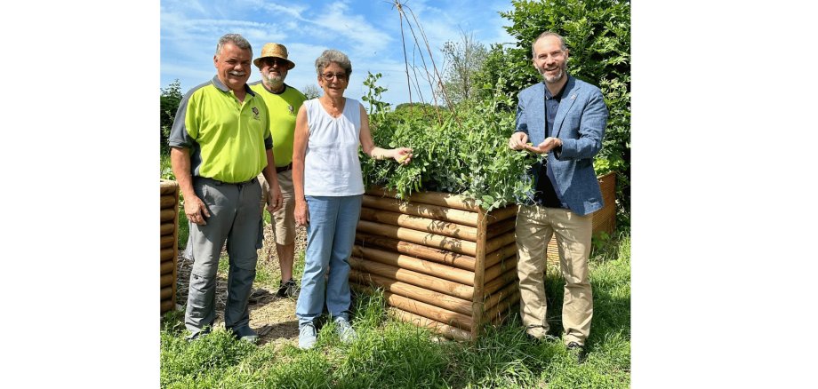 Vorsitzender Bayer, bis zu seinem Renteneintritt in der Getränkebranche aktiv, dankte Bürgermeister Bär für die Unterstützung der Stadt Nidderau, die weit über die Prämie für den Umwelt- und Nachhaltigkeitspreis hinausgeht. 2023 stellte die Stadt dem OGV ein brachliegendes Gelände am Nidderufer zur Verfügung. Die 350 Quadratmeter Wildwuchs wurde von den Mitgliedern gerodet, aus dem Grünschnitt eine Schutzhecke für Insekten, Vögel und Kleintiere angelegt. Auf der neu entstandenen Freifläche entstanden unter anderem acht Hochbeete, von denen drei von der Stadt gesponsert wurden. „Gemeinsam Gärtnern“ heißt eine der Arbeitsgruppen, die die Pflege der Hochbeete übernimmt, Interessierten Tipps gibt und beispielsweise den Gießdienst per Mobiltelefon-App organisiert.